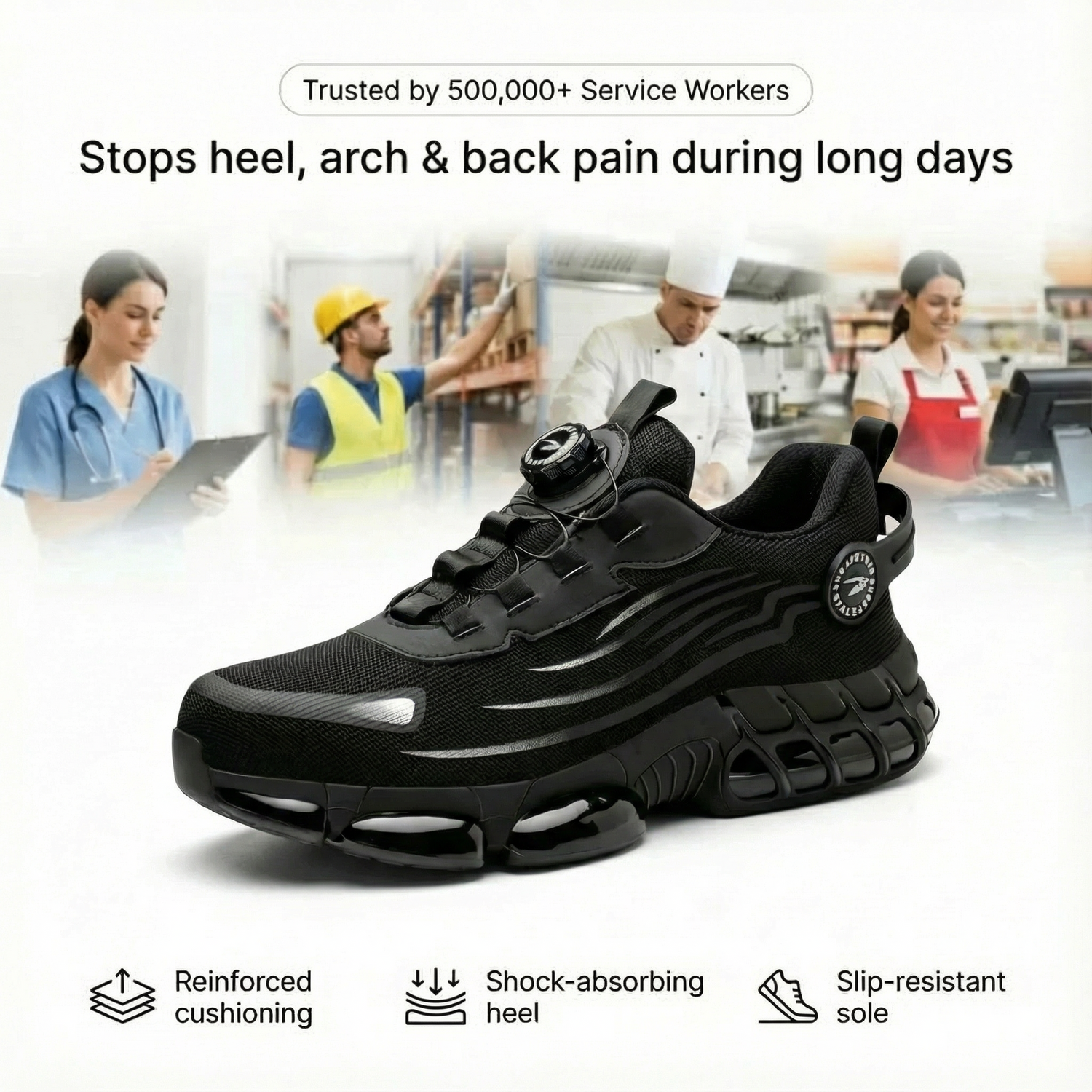 Most shoes are built for casual walking — not slippery kitchens, polished hospital floors, or hard warehouse concrete.