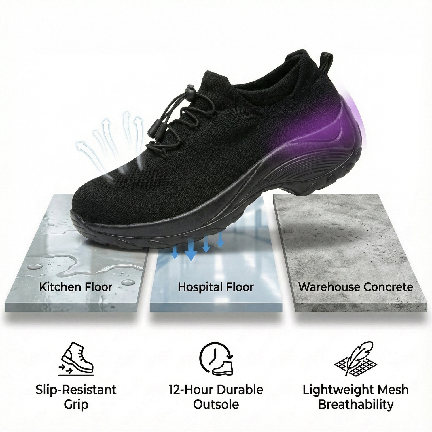 Most shoes are built for casual walking — not slippery kitchens, polished hospital floors, or hard warehouse concrete.